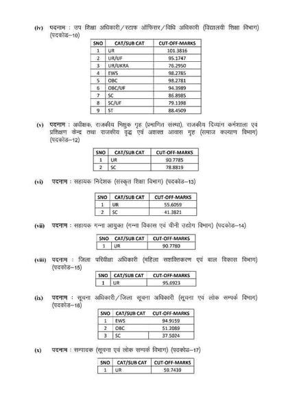 कट ऑफ मार्क्स को पद, वर्ग (सामान्य, ओबीसी, एससी, एसटी) एवं उपश्रेणियों के अनुसार प्रकाशित किया गया है।