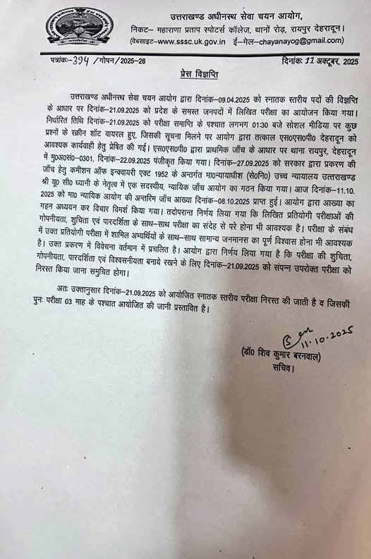 उत्तराखण्ड के मुख्यमंत्री श्री पुष्कर सिंह धामी ने एक अहम निर्णय लेते हुए उत्तराखण्ड अधीनस्थ सेवा चयन आयोग (UKSSSC) द्वारा 21 सितंबर को आयोजित स्नातक स्तरीय भर्ती परीक्षा को निरस्त करने की घोषणा की है। यह कदम परीक्षा में सामने आए नकल प्रकरण की जांच रिपोर्ट के आधार पर छात्रों के हित में उठाया गया है।